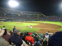 ♪ 天然芝がライトに照らされて鮮やか。 オリックスはJP、西武は松阪。 この日は両投手の出来が特に良く、本当に投手戦。 西武の栗山選手は、次女と中学の同級生。 若くして西武のレギュラーの一員。 娘が一塁側内野席からわざわざレフト 外野席まで写真を撮りに走った。 |